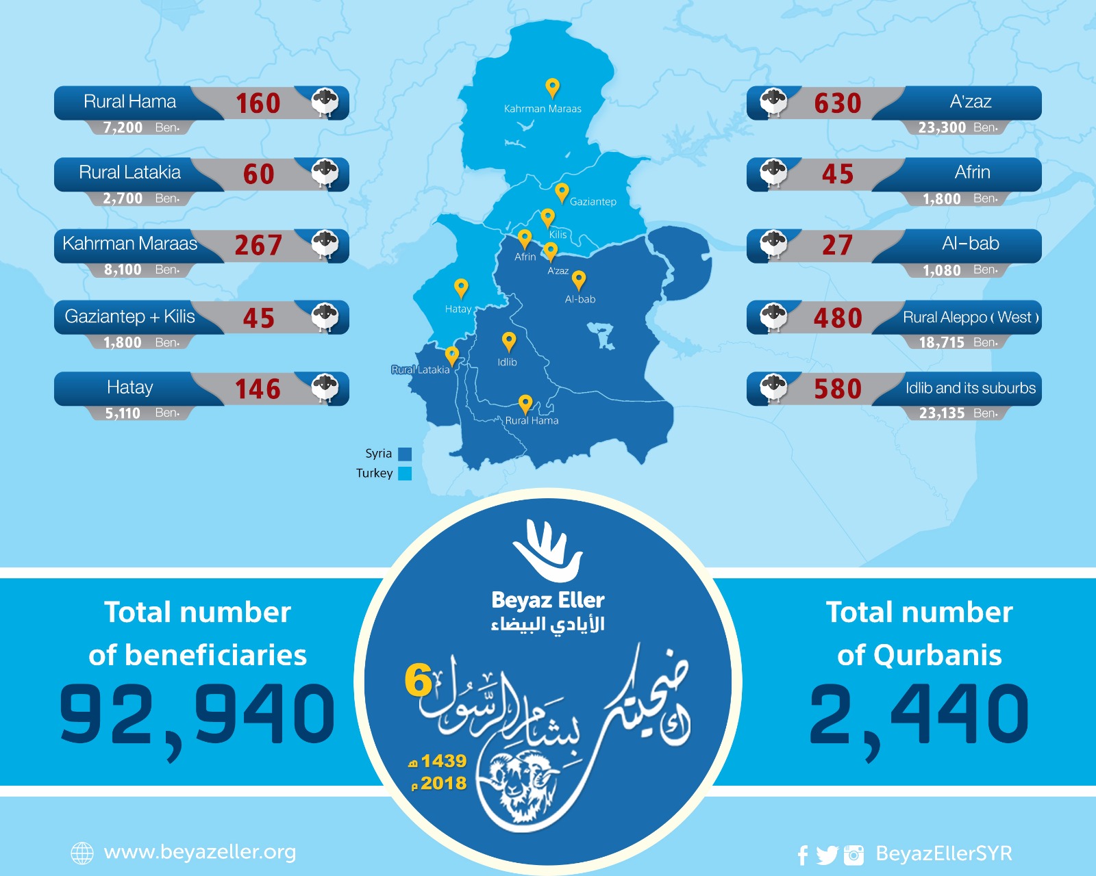 As a result of Beyaz Eller Organizations’s efforts to raise awareness of the Syrian refugees in Turkey, the organization has bought a large collection of Qurbani animals and distributed them to those in need, in cooperation with “Qatar Charity”, “Abdullah Al Nouri Charity Society” and “Islamic Relief”.